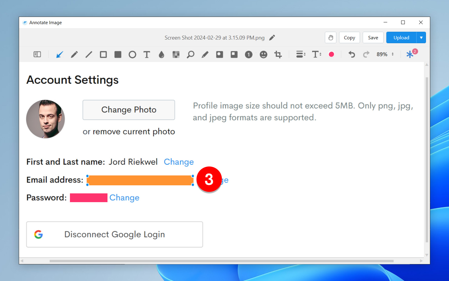 The Jumpshare desktop app automatically detects sensitive information (email addresses, passwords, IP addresses, and credit card numbers) in screenshots and lets you hide it all with a single click within the annotation window.