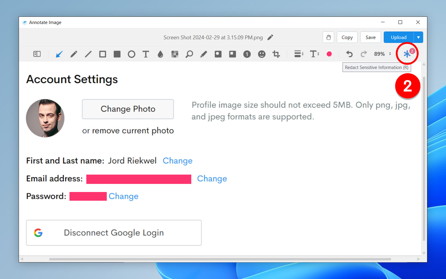 π The badge on top of the Redact Sensitive Information icon shows the number of instances of sensitive information detected in the screenshot or image.